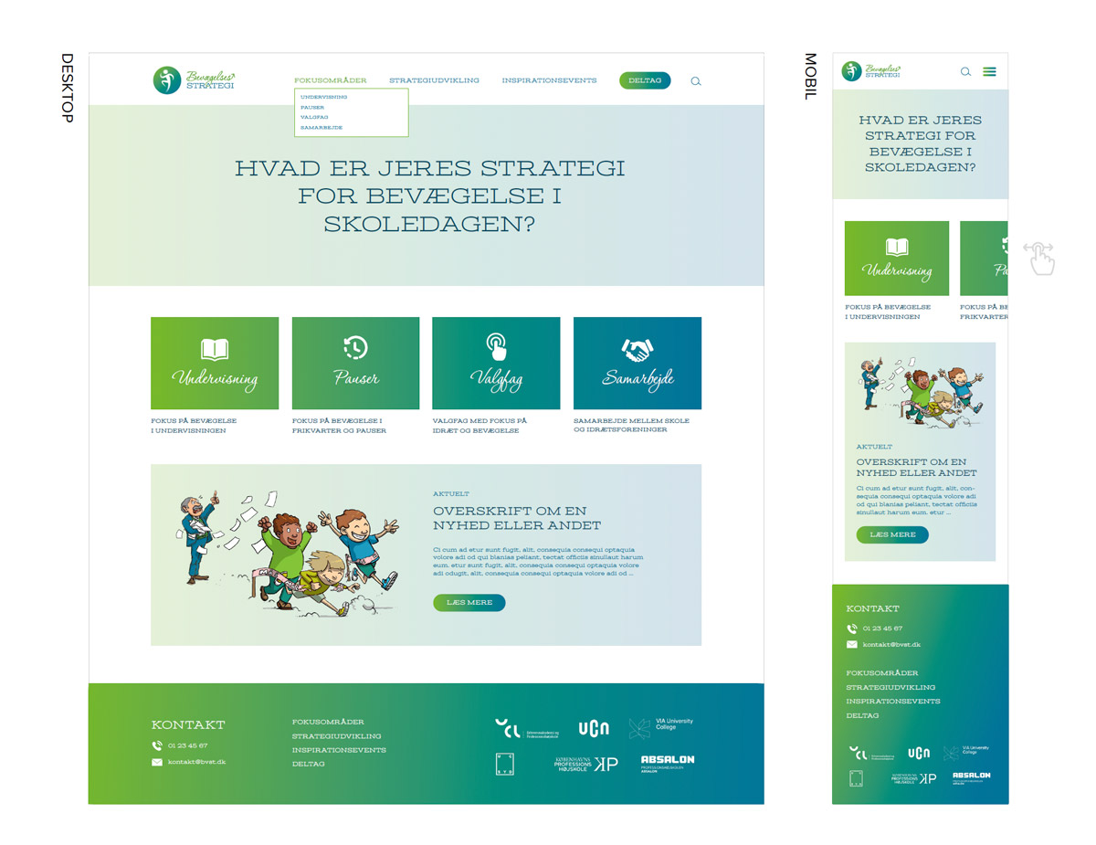 Bevægelsesstrategi er et større landsdækkende projekt, der går ud på at få folkeskoleelever til at røre sig mere i hverdagen. Min opgave var at skabe den visuelle identitet og udforme kampagneelementer.