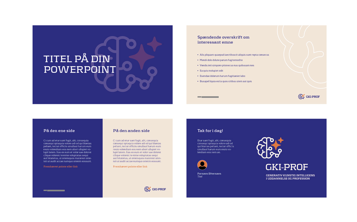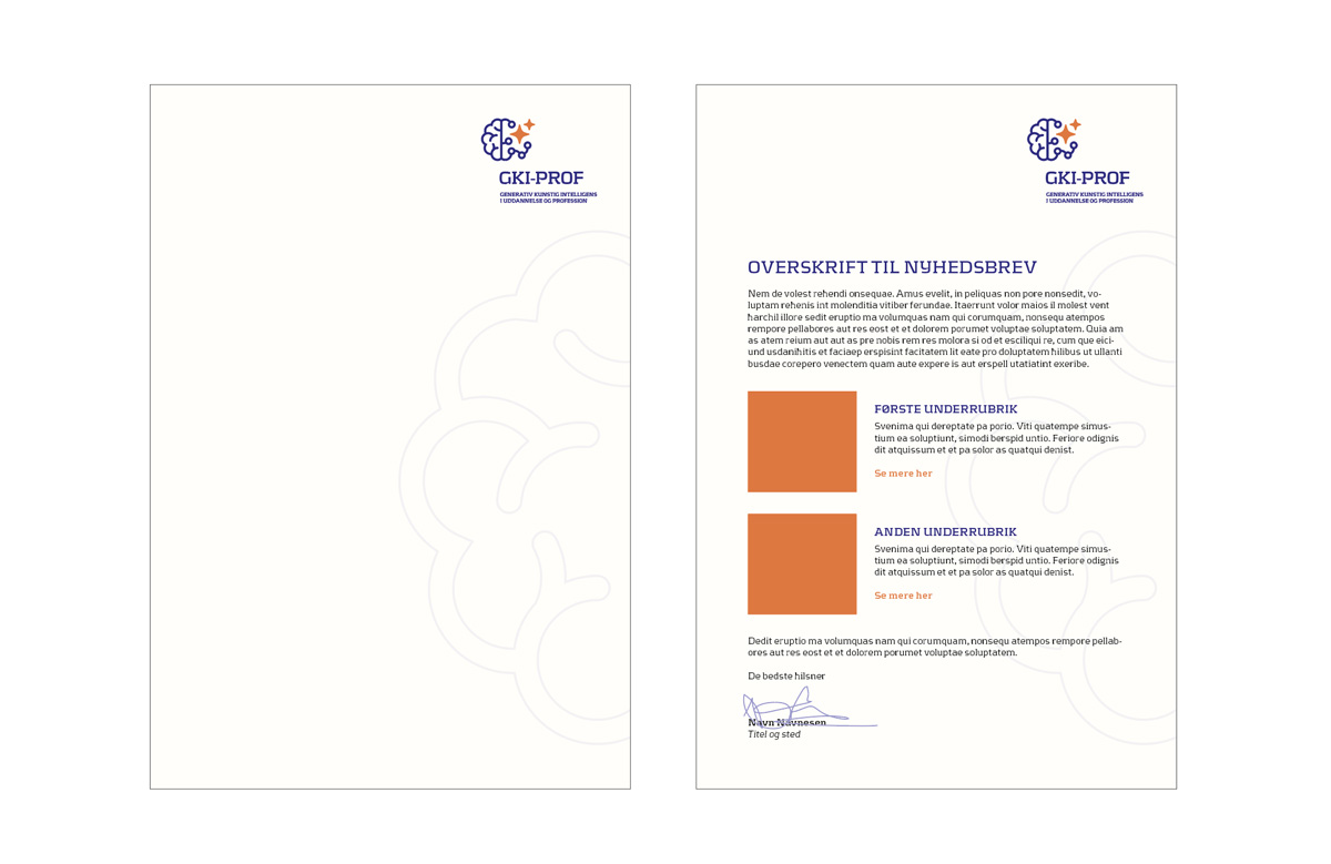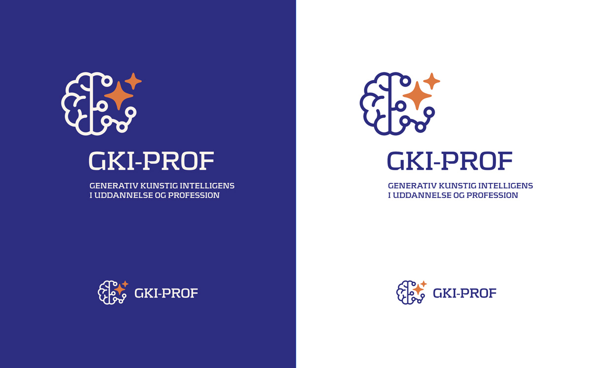 Projektet GKI Prof er et nationalt projekt, der handler om integration af generativ kunstig intelligens i uddannelse og profession. Min opgave var at designe et logo + stil/tone, der kunne tilgodese en eksisterende farvepalette.